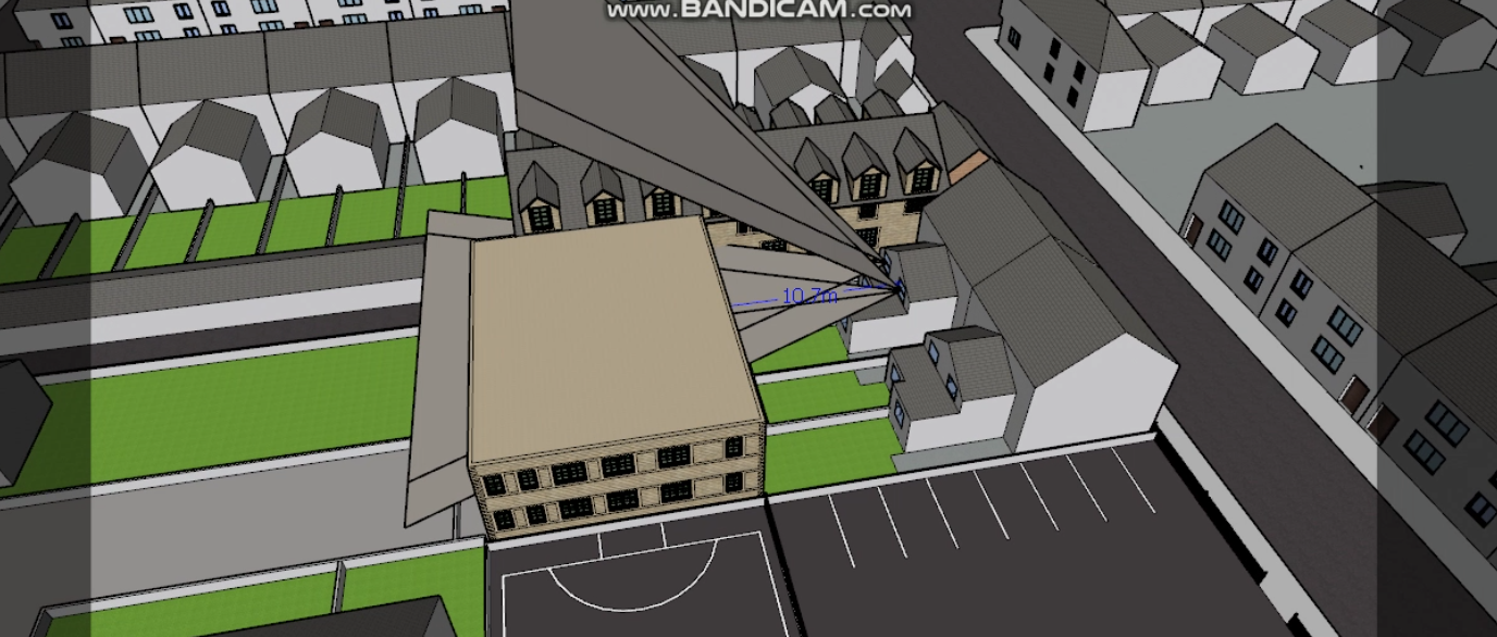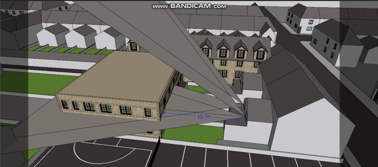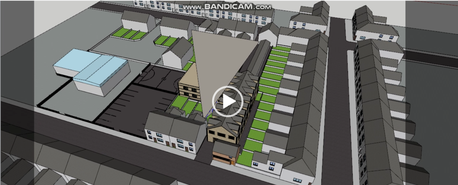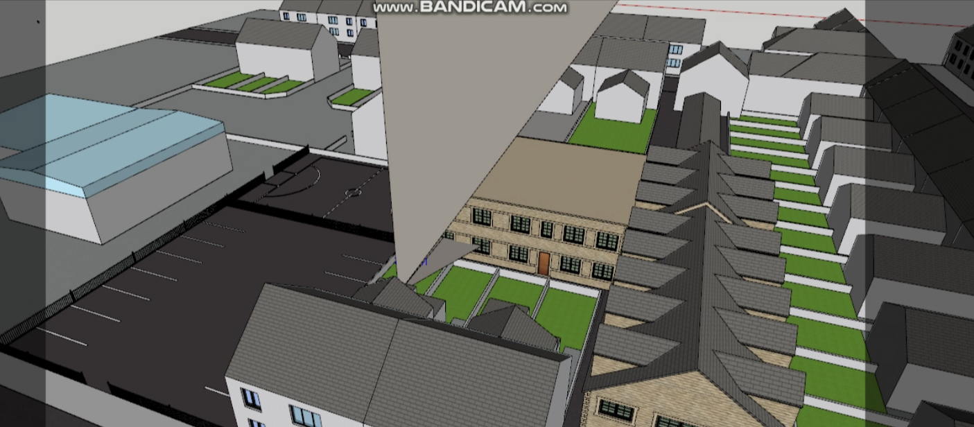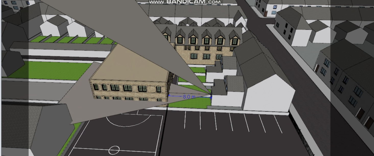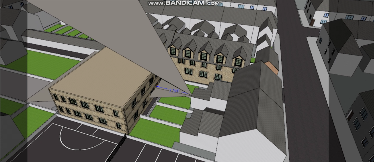 Figure 1.2 This CGI was made as part of our compliance studies to determine whether different alterations and solutions would cause loss of light. This image is referred to here to show how the height of the modified extension (being the same as the existing extension top height) is lower than ALL the surrounding buildings. Its view is completely concealed from all main roads. It is only possible to view part of it from the private car park and playground. The view of this extension from Harold Street is mainly concealed.