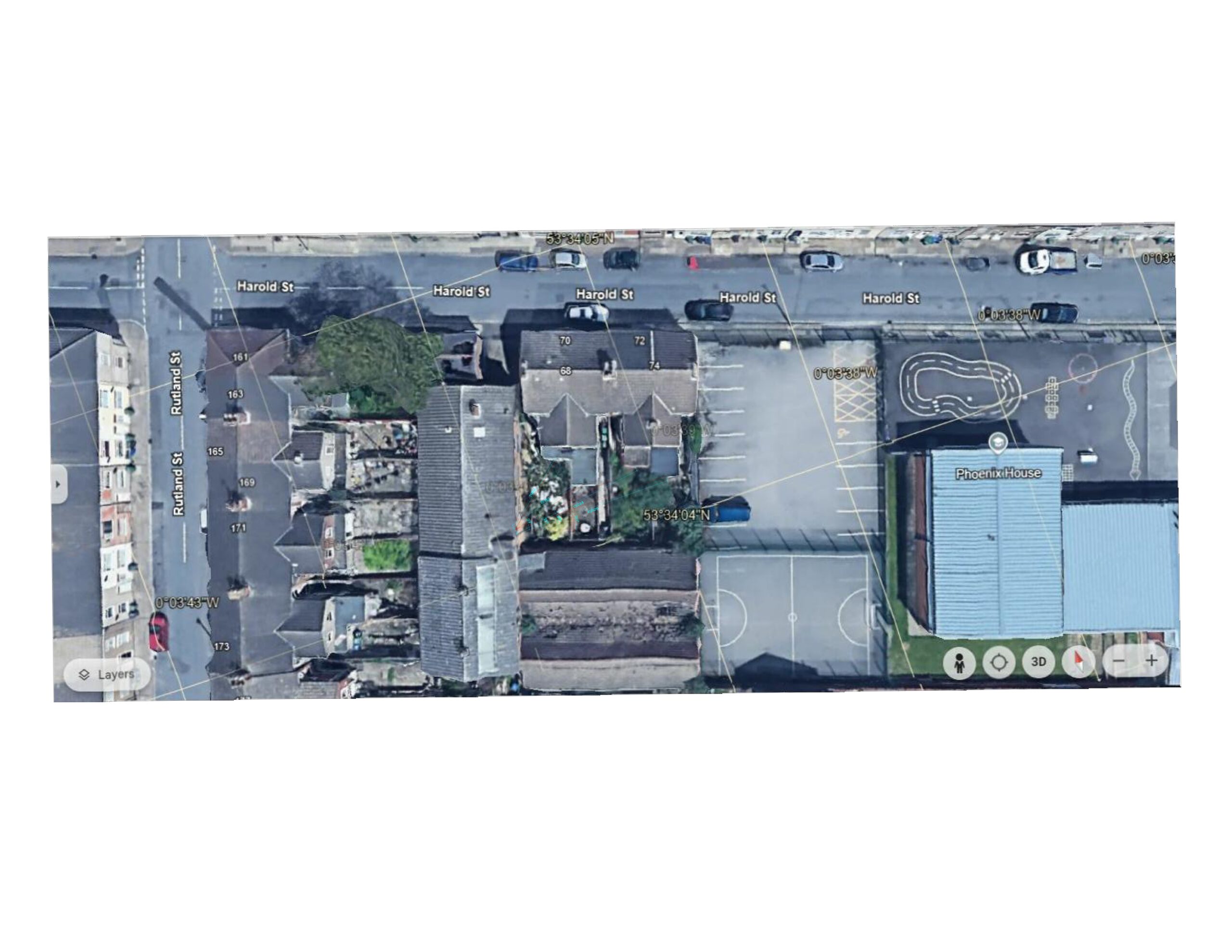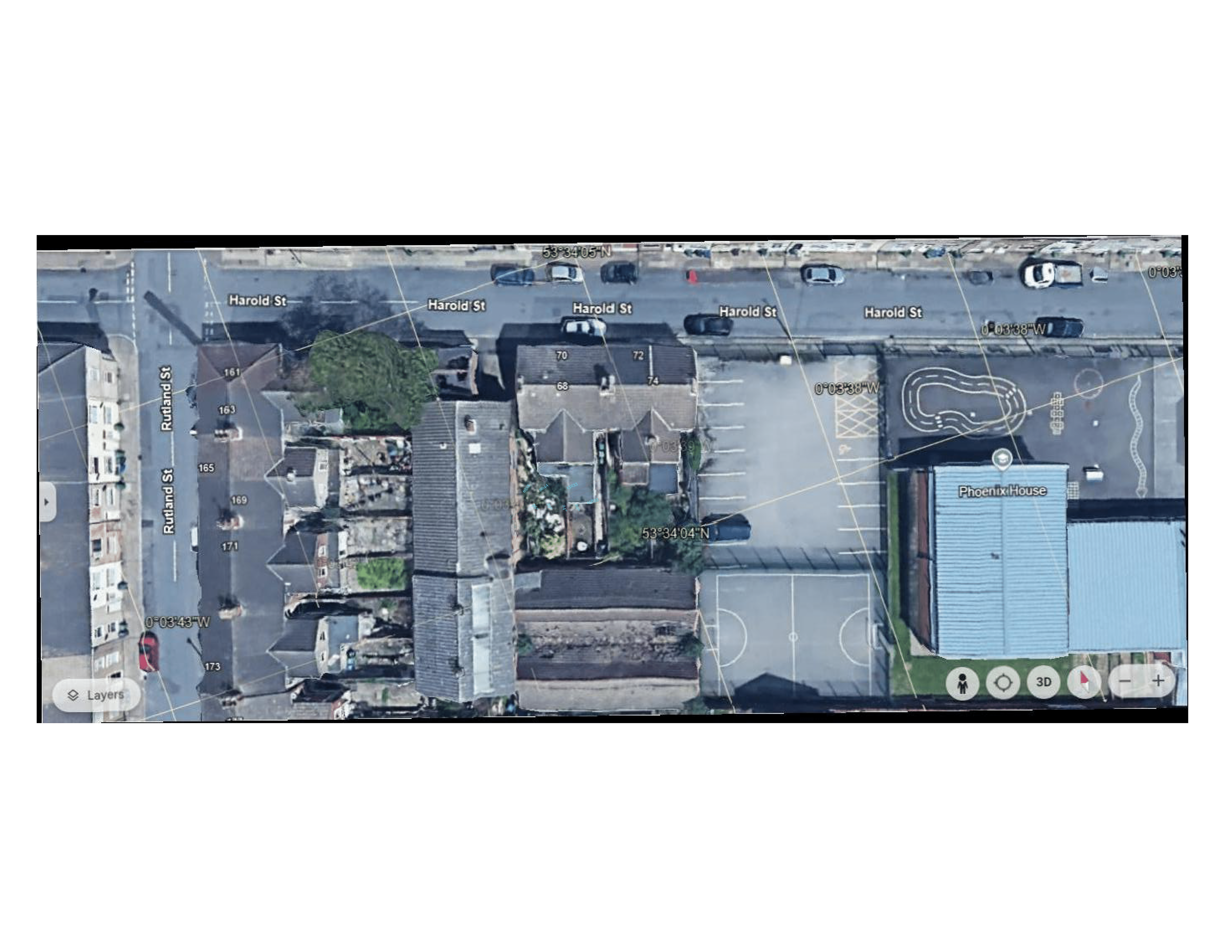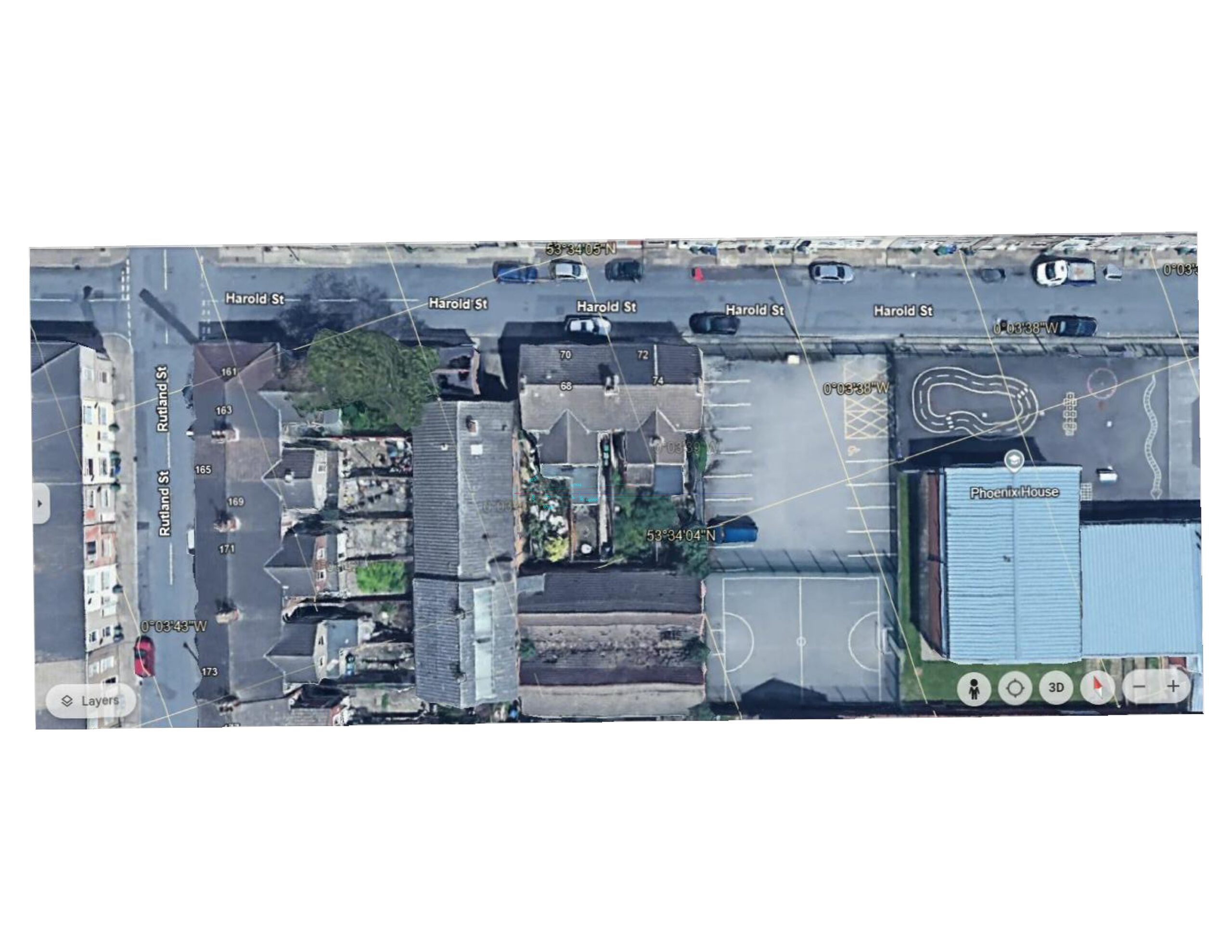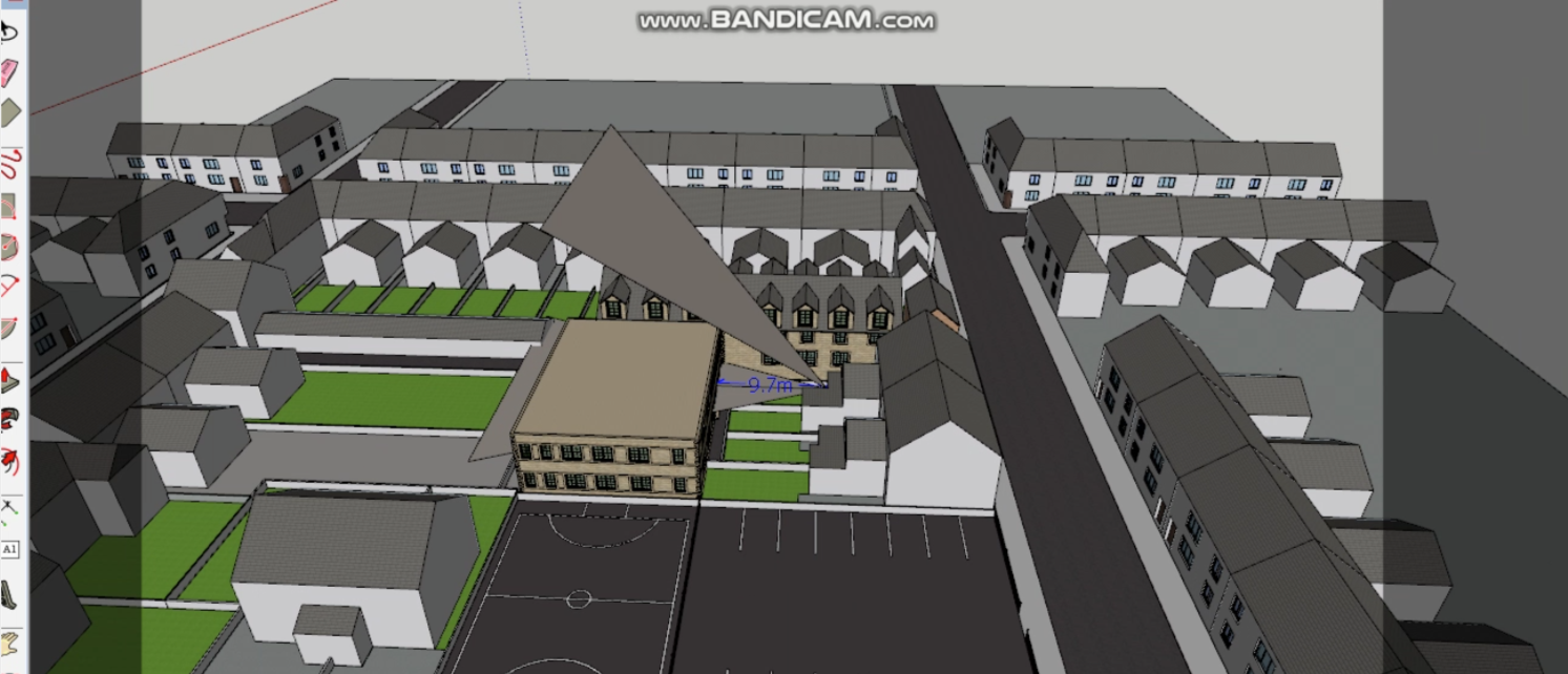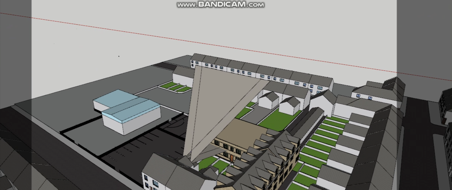 Figure 1.2 This CGI was made as part of our compliance studies to determine whether different alterations and solutions would cause loss of light. This image is referred to here to show how the height of the modified extension (being the same as the existing extension top height) is lower than ALL the surrounding buildings. Its view is completely concealed from all main roads. It is only possible to view part of it from the private car park and playground. The view of this extension from Harold Street is mainly concealed.