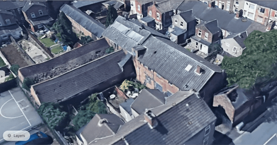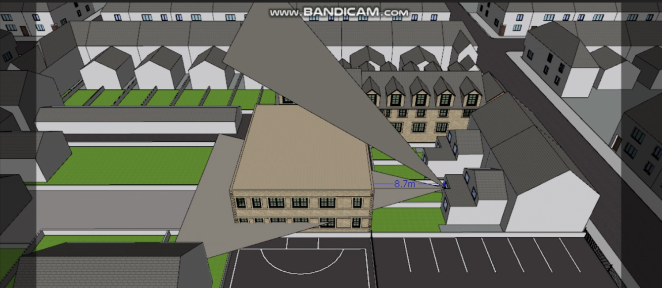 Figure 1.1 We can see the two double-pitched roofs of the extension. Our proposal is to alter the extension to place a flat roof at the height of the existing roof ridges. Therefore, the top height of the extension will remain the same. Note that the main building’s top ridge height is a comparable height to the existing houses surrounding it. Because of this, the main building (which is higher than the extension) is not visible from the main roads. The height of the top ridges of the extension is one storey lower than the main building. Therefore, the extension is even less likely to be seen from any main road. The building as a whole is concealed by the surrounding houses.